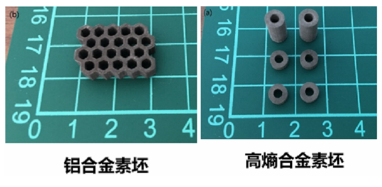 高熵合金AlCrFeNiCoCu 打印材料,工藝為將光固化樹脂與表面改性的高熵合金粉末混合,并添加光引發(fā)劑,通過特定波長(zhǎng)的紫外光固化,制成產(chǎn)品坯體;此坯體在特殊的熱處理爐中通過脫脂工藝將樹脂成分去除,通過燒結(jié)工藝達(dá)到產(chǎn)品的致密化。