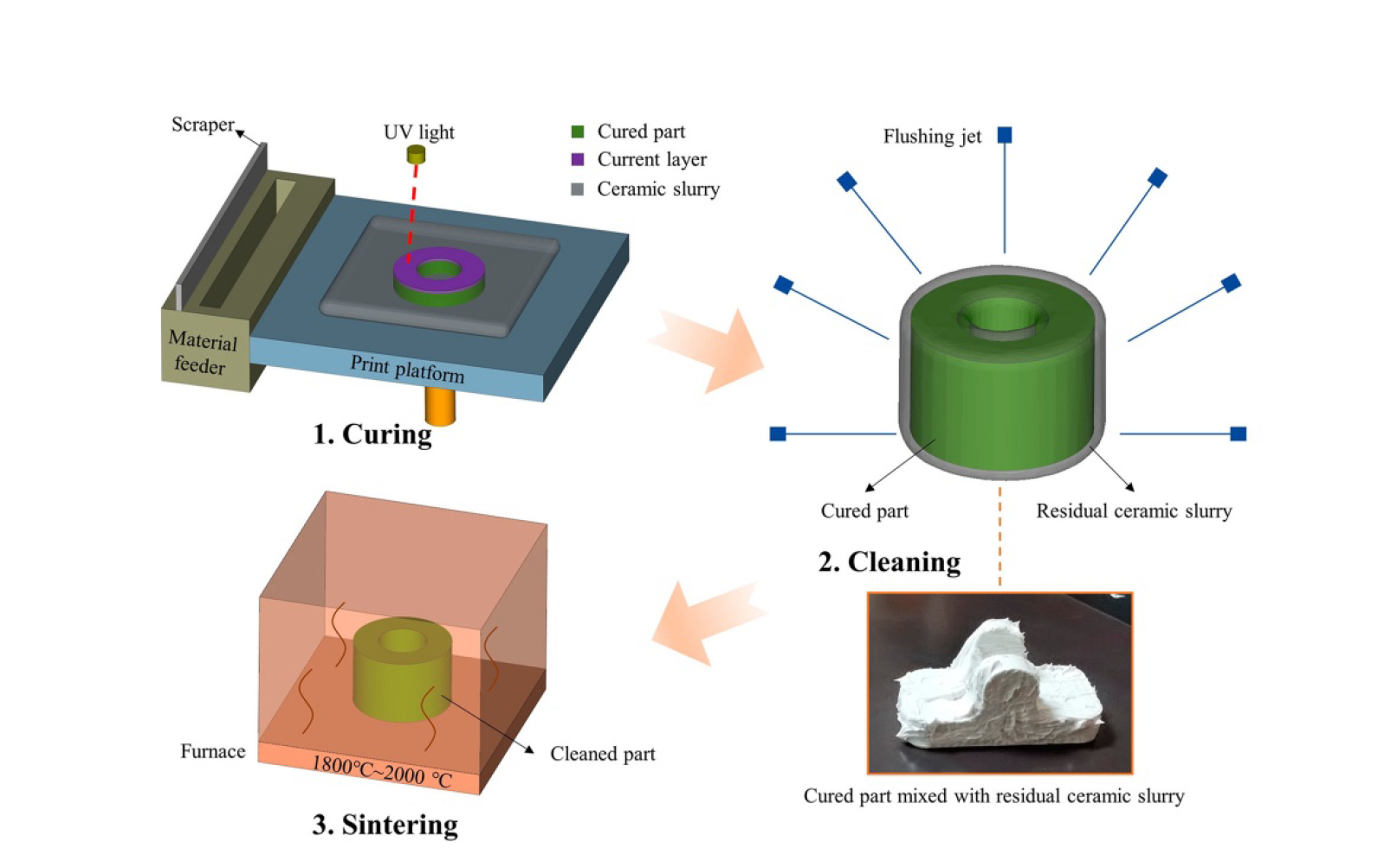 如圖中所示的光固化立體成型流程中,步驟二的清洗環(huán)節(jié)至關(guān)重要,因?yàn)槿魵埩籼沾蓾{料未能徹底清除,會增加部件的重量,并降低燒結(jié)部件的形狀精度和表面質(zhì)量。然而,對于清洗液沖洗射流無法觸及的孔洞、通道及其他復(fù)雜幾何形狀部位,清除殘留漿料就成了一項(xiàng)復(fù)雜甚至難以完成的任務(wù)。