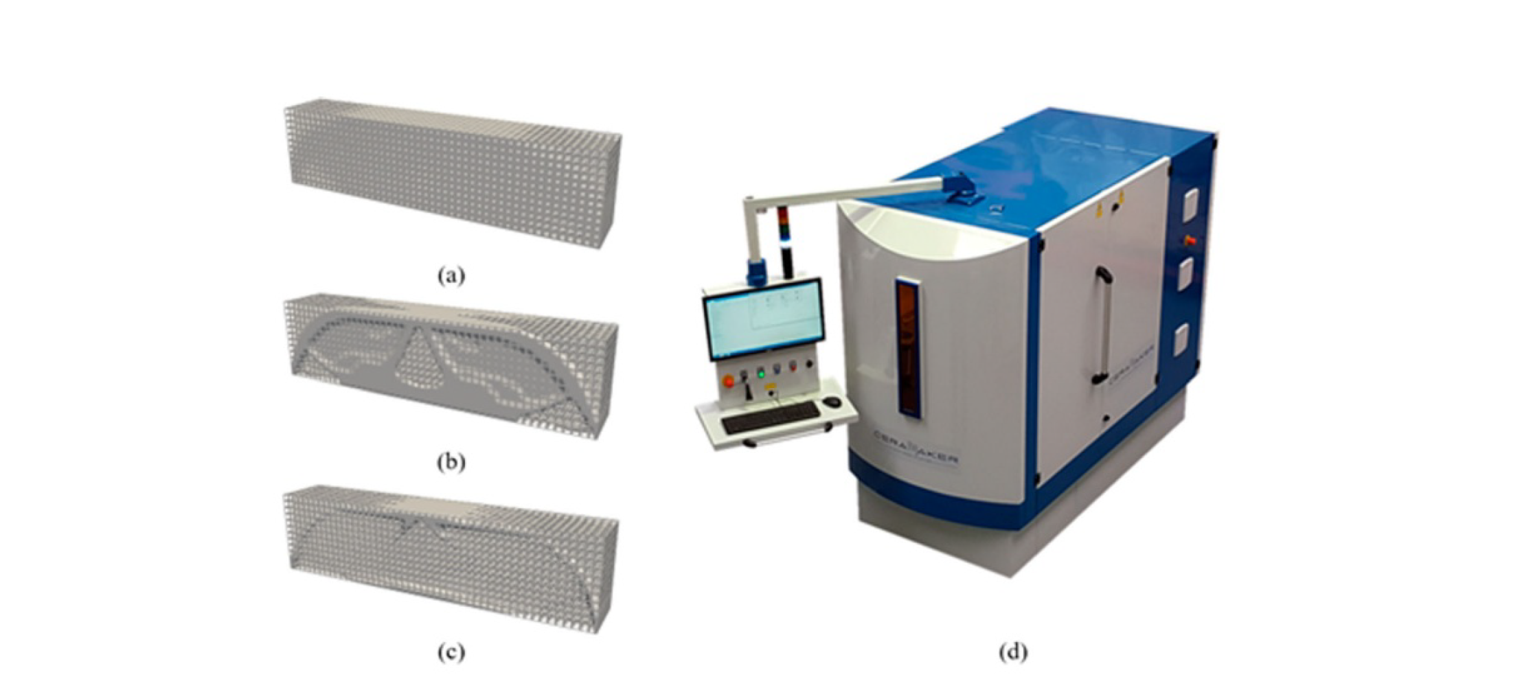 上圖展示了對三組優(yōu)化的三維MBB梁模型進(jìn)行了增材制造和清洗測試,以驗(yàn)證所提出方法的有效性。圖為總結(jié)構(gòu)尺寸為120 mm x30mm x20 mm的三維MBB梁模型,分別為(a)梯度點(diǎn)陣填充設(shè)計、(b)不考慮沖刷可達(dá)性約束的LSHS設(shè)計和(c)考慮沖刷可達(dá)性約束的LSHS設(shè)計,使用 3D打印機(jī)C900 Flex (3D Ceram, France)打印優(yōu)化結(jié)果。
