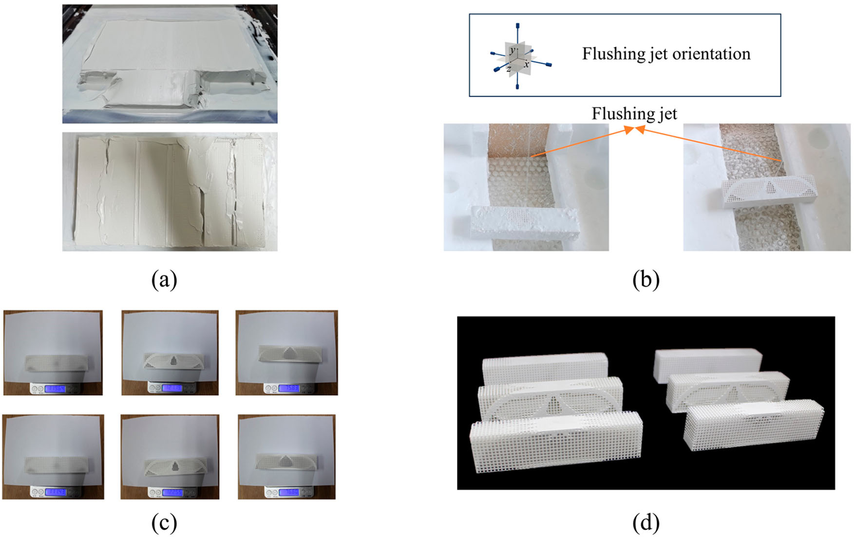 上圖展示了清洗實(shí)驗(yàn)過程。首先,如圖 (a)所示,將附著有大量殘留陶瓷漿料的固化部件從打印平臺上取下。然后,用刮刀對附著在部件外表面的未固化漿料進(jìn)行初步清理。之后,如圖 (b)所示,沿著部件的六個方向(上、下、左、右、前、后)用水射流對部件進(jìn)行沖洗。每個部件在單個沖洗方向上的沖洗時間均為 5 分鐘。最后,對清洗后的三組部件進(jìn)行稱重以評估清洗效果。參照圖 (c),這六個部件的重量分別為 119.64 克、111.43 克、121.19 克、122.55 克、75.83 克和 76.80 克??梢园l(fā)現(xiàn),由于引入了沖洗射流可達(dá)性濾波器,所提出的設(shè)計避免了固相中出現(xiàn)倒扣特征,并且固體材料集中在結(jié)構(gòu)的 z 軸對稱表面。同時,由于考慮了沖洗射流的有效沖洗強(qiáng)度,消除了深孔特征,從而實(shí)現(xiàn)了最佳的清洗效果。然而,梯度晶格結(jié)構(gòu)設(shè)計和另一種晶格 - 實(shí)體混合結(jié)構(gòu)(LSHS)設(shè)計由于出現(xiàn)深孔和倒扣結(jié)構(gòu)特征,清洗效果較差。